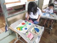 4年生図工の授業の様子です。世界にひとつしかない貴重な「幻の花」を描いています。スポンジやローラー、歯ブラシと金網、自分の指などを使ってオリジナルの花を咲かせています。