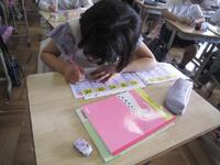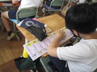 1年生算数の授業の様子です。絵を見ながら牛やちょうちょの数をおはじきを使って数えています。数え終わったらノートの丸印を塗りつぶしていきました。