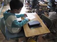5年生外国語の授業の様子です。英文を聞きながら、聞き取れたことや分かったことをプリントに書きだし、当てはまる場面絵を選んでいます。全部を聞き取れなくてもキーワードとなる単語がヒントになりそうです。