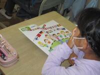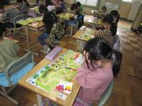 1年生算数の授業の様子です。絵を見て、にわとり、たまご、ちょうちょ、たんぽぽの数をおはじきを使って数え、色を塗っていきました。間違えずに数えることができたようです。