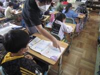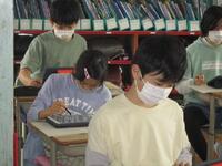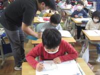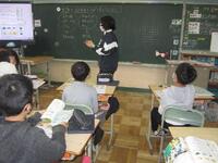 4年生算数の授業の様子です。60億の10倍、100倍、1000倍など、大きな数の発展問題に挑戦しています。解答したら先生がアドバイスしながら採点しています。