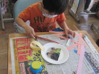 1年生の図工は、6年生への感謝の気持ちを込めて、お花のプレゼントを作成しています。紙皿に写真とメッセージを貼り、色画用紙で花びらを装飾しています。感謝の気持ちが6年生にしっかりと届くように、丁寧に慎重に花びらをのりで貼り付けました。