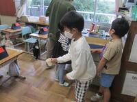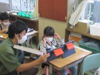 1年生は生活の授業で、「秋のものづくり」計画をしています。作るものの絵や集めるもの、用意するものをワークシートにまとめています。また、先生が見本で作ったおもちゃを試しながら参考にしています。楽しいおもちゃができるといいですね。