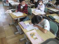 1年生国語の授業の様子です。見付けたものを詳しく伝えるために、原稿用紙を使って文を書いています。正しい原稿用紙の書き方いついて、先生から詳しく説明がありました。「行」と「マス」をしっかりと理解して丁寧に仕上げています。
