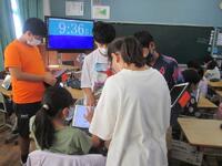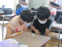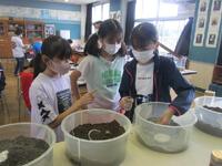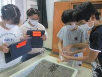 5年生理科の授業の様子です。土の斜面に水を流し、土や砂がどのように削られ、運ばれていくかについて、実験をしながら動画に撮って、流れる水がどのような働きをしているかについて追究しています。扇状地ができているグループもありました。