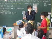 3年生算数の授業の様子です。プリンのカップやゼリーのカップに色水を注いでいき、水かさを測る実験をしています。1デシリットルの端数部分を小数で表すにはどうしたらいいかを追究しています。