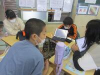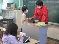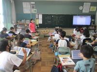 5年生社会の授業は食糧生産の学習です。日本の食料を確保するための有効な方法について追究していますが、理由や根拠を明確にするために、表やグラフなどの資料も活用しながら各自の意見をまとめています。みんなの意見を見ながら先生が個別にアドバイスを送っています。