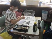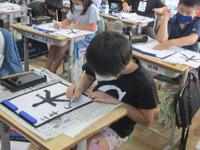 3年生書写の授業の様子です。「木」という字の最後のはらいに気を付けています。力の入れ具合を調整し、ゆっくりスムーズに筆をまとめていきます。学年と名前の間隔にも注意しながら手本を見て丁寧に書いています。