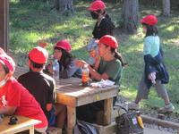 ウォークラリーの後は、飯ごう炊飯の準備です。お米を上手に炊くには、水加減が重要です。子供たちは、お米をこぼさないように丁寧に飯ごうに移し替え、真剣な表情で何度も水加減を確かめていました。さあ、おいしく炊けるかな?