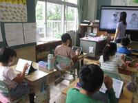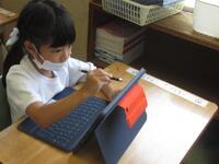 1年生算数の授業の様子です。絵を見ながら「ぜんぶでいくつか」について、式を立て答えを出しています。「+」と「=」の記号を使ってしっかりと式を作ることができました。
