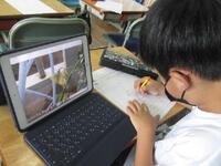 2年生生活の授業の様子です。ミニトマトの生長を写真に撮り、じっくりと観察をしています。つぼみや花の色や形、花びらの数など以前と比べて変化したところをワークシートにまとめています。