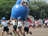 2年生の団体競技はだるま運びです。何度も練習してきただるま運びのレース、今日は今までで一番速いスピードでした。友達と息を合わせ、協力してだるまを運ぶ真剣な姿が輝いていた2年生です。