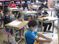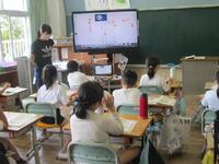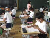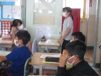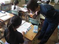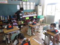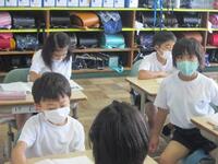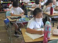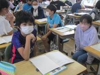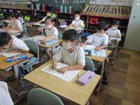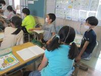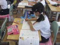 昼休みと清掃活動が終わり、5時間目の授業が始まる前の様子です。1年生は、自分の身の回りを整頓し、素早く学習の準備を整えていました。机の上には、5時間目に使用する学習用具が置かれています。入学してから2ヶ月。学校生活のリズムがしっかり身についてきています。