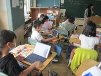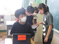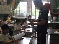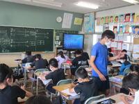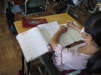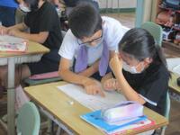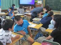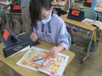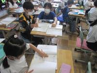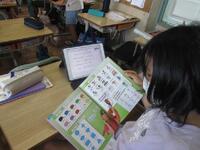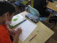 4年生外国語活動の様子です。天気に合う服装と遊びについて英作文をしています。なかなか難しい課題ですが、自分で単語を調べたり、先生に聞いたりして発表に備えています。