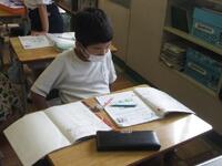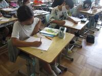 4年生算数の授業の様子です。3桁の割り算について、先生から次々に問題が出されています。教科書の問題、プリント問題、板書した文章問題、そしてまたプリント問題です。自分のペースで確実に答えを導き出しています。