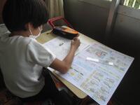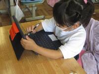 1年生国語の授業の様子です。「~が~。」という短い文をつくり、メタモジでカルタを作っています。絵を描いて色を塗って独自のカルタの完成です。メタモジの使い方にも慣れてきました。