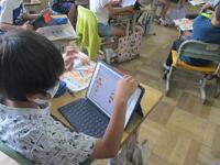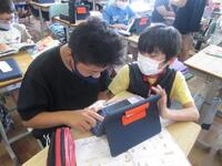 算数の授業で分数×分数の計算方法を考えています。なぜ、分母同士、分子同士をかけて計算してもよいのか、タブレット上の面積図や途中式を示しながら、友達に自分の考えを説明しています。「今のところ、もう1回説明してもらえる?」など、友達と関わり合って、学習を深めていく姿が見られました。