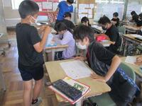 5年生算数の授業の様子です。8mで480gの針金が15mのときは何gになるかという問題を数直線や表を使って解き、友達同士で確認しました。1mあたりの重さを出してから求めることを理解しました。