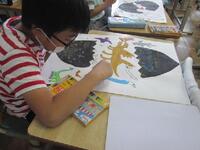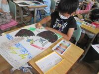 2年生図工の授業の様子です。「ひみつの卵」がもうすぐ完成です。カラフルな卵の中から不思議なものがたくさん出てきています。今日はこのあと背景を塗っていきます。