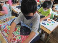 図工「ぼく、わたしの宇宙」では、身の回りの素材と絵の具を使って、絵画作品に取り組んでいます。綿棒、歯ブラシ、石けんを入れるネット、段ボール、ビー玉、スポンジ、割り箸、ペットボトルキャップ等、子供たちはいろいろな素材や技法を自由に試しながら、楽しく活動しています。