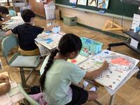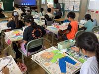 3年生、図画工作の様子です。ガリバーの絵に色塗りをしていました。薄い色から濃い色へ、水で溶かして濃淡を付ける等の基本技法を学びながら、グラデーションや奥行きのある表現に挑戦していました。