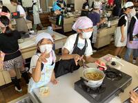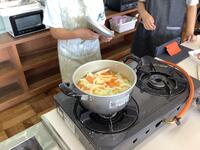 5年生、家庭科の様子です。今日もカレー作りです。タマネギ、にんじん、ジャガイモの皮をむいてカットします。お肉も食べやすい大きさにカットします。あくを取って、ジャガイモが柔らかくなったらルーを入れて完成です。お米はしっかりといで、ガラス鍋に入れて炊いていきます。蓋をして弱めの中火にかけます。泡が大きくなり、湯気が勢いよく出てきたら沸騰の合図です。湯気が弱まり、泡が消えてきたら火を止めます。蓋をしたまま10〜20分蒸らします。おいしいカレーのできあがりです。