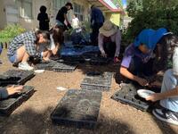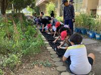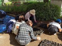 花サポートの皆様と花壇委員の子供たちが「ビオラ」と「ハナナ」の種まきをしました。ポットに土を入れ、種を数粒ずつまき、土をかぶせ、水やりをしました。順調にいけば一週間程度で芽が出てくるはずです。