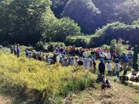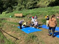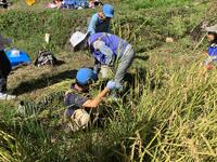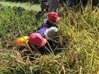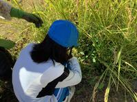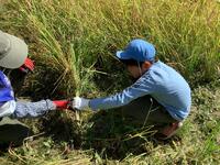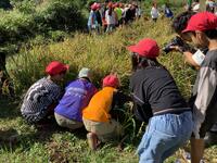 田んぼへ移動し、いよいよ稲刈り開始です。数人ずつ田んぼに入り、鎌を使って稲を刈っていきます。