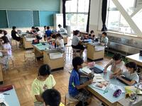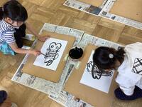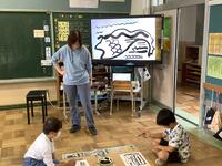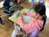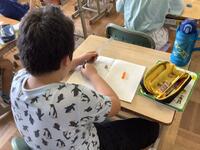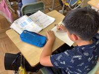2年生の図画工作の授業の様子です。墨汁と筆をつかって、魚を描いていました。はじめに筆で絵を描くための筆づかいの練習です。子供たちは「筆で絵を描くのははじめて」と言いながらも、筆をうまくつかっていました。練習後に、実際に魚を描き始めましたが、とても魅力的な魚ができあがっていきました。魚の動きやうろこなどもうまく表現していますね。