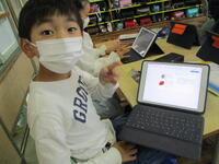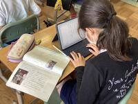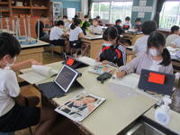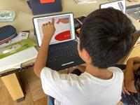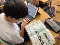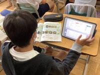 4年生の国語の授業の様子です。説明文「手で食べる、はしで食べる」の意味段落の要点を整理して、筆者の考えを整理する活動に取り組んでいました。子供たちは、それぞれの段落を読んで、1人1台端末の表に書き込んでいきます。端末を用いて表にまとめていくのも手際よくできていました。活用スキルが上がっていますね。