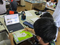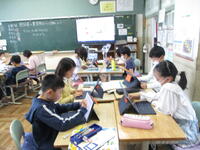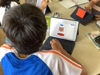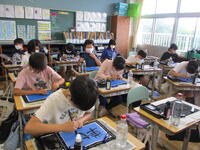 社会科のグループ学習の様子です。静岡の特産物であるいちご、メロン、みかん、お茶、わさびの中から一人一つを担当し、タブレットを活用して情報を集め、ワークシートにまとめています。次回の授業では、自分が担当した特産物について、班の友達に発表する予定です。「よし!いいのができたぞ。」と自分のシートを見返し、自信を深めている子供のつぶやきも聞こえてきました。