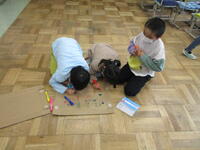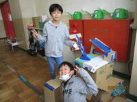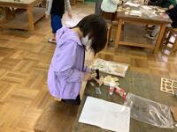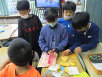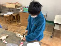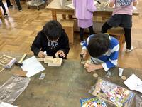 3年生の図画工作の授業の様子です。「くぎうちトントン」と題して、木材に様々な形のボードをくぎで打ち付けたり、接着剤で貼り付けたりして、作品を仕上げていきます。くぎと金づちの使い方に注意しながら、子供たちは取り組んでいました。だんだんと金づちの扱い方も上手になってきている3年生です。