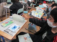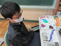 6年生の図工の様子です。言葉がもつイメージを小さな絵画で表現しています。題材にする言葉の選択にも、その子の個性が表れています。「暖かい場所」「時空のはざま」「光とは」「圧」など、言葉と絵画の結びつきが楽しい作品になっています。この小さな絵画が集まり、最後は自分の世界が出来上がるという仕掛けだそうです。完成が気になります。