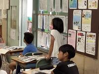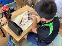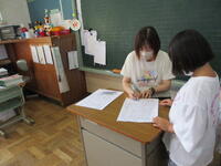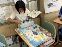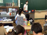 1年生の教室では、子供たちが、静かに算数学習のまとめプリントに取り組んでいました。わからないところや質問したいことがある時は、黙って手を上げ、教師に合図を送ります。学習のルールがしっかり定着していることが伝わってきました。また、授業後には、配達係が手際よく協力して配達物を配る姿も見られました。学習面も生活面もレベルアップしています。