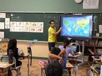 4年生の外国語活動の授業の様子です。「What time is it ?」「It's 7 AM.」の言い方に親しんでいます。その中で、今日の授業では、世界の各地の時刻についても考えました。東京、ロンドン、サンフランシスコ、ニューヨークでは、いま何時で何をしているのかということを聞いて、時計を完成させ、イラストを選んでいきます。日付の早い順の世界地図を見ながら、これらの都市の中でも、日本の日付と時刻が早いことを確認していきました。