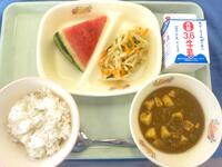 ☆麦入りご飯☆牛乳☆豆腐のカレー煮☆じゃがいもの中華サラダ穂☆スイカ