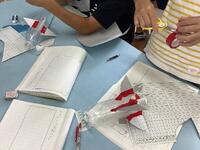 4年生理科で、縮められた空気が押し返す力を使って、水ロケットを製作しました。