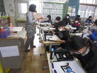 6年生書写の授業の様子です。書く前に先生からは、細かな筆使いによって書道の味が出たり、美しく見えたりすると教わりました。手本を見ながら細かいところに注意して練習していました。