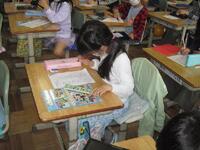 2年生算数の授業の様子です。時計の読み方と長針、短針の書き方についての学習です。長針と短針の長さが同じにならないように、短針を短く書くことがポイントであると先生から説明がありました。