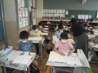 3年生図工の授業の様子です。1色でおもしろい線を描いていきます。太かったり細かったり、まっすぐだったりギザギザだったり・・・パレットで水の量を調節しながら色の濃さにも注意しながら作品を作っています。