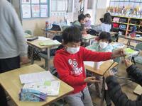 3年生理科の授業の様子です。「音が出るときに物はふるえているのかどうか」の実験をしています。トライアングルに付箋2枚を貼り付け、付箋の揺れを観察しています。「あ、ゆれた」「すごい」などの声が上がっていました。全員がトライアングルをたたいて実証することができました。