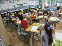 1年生の音楽では、カスタネットでリズム打ちをしています。今日は、拍の流れにのって食べ物に関係した言葉をみんなでリレーのようにつないでいきました。何度か試すうちに、「スイカ」と「オムライス」では音の数が違うので、話す速度を調節すると、上手にリレーができると気がつくことができました。