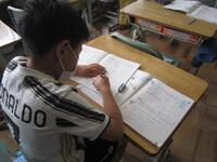 4年生算数の授業の様子です。60億の10倍、100倍、1000倍など、大きな数の発展問題に挑戦しています。解答したら先生がアドバイスしながら採点しています。