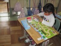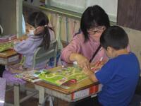 1年生算数の授業の様子です。絵を見て、にわとり、たまご、ちょうちょ、たんぽぽの数をおはじきを使って数え、色を塗っていきました。間違えずに数えることができたようです。
