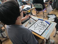 6年生の図工では、墨の特色を生かした絵画作品に挑戦していました。様々な太さの線や形、墨の濃淡を使い分けて描いていきます。出来上がった作品に似合うタイトルをみんなで考え合う場面では、「魔界の地図はどう?」「おお、なんかかっこいい!」など、ユニークなタイトルが次々発表され、盛り上がっていました。