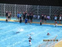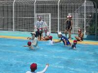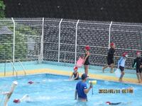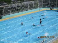 暑い日差しの中、3年生はプールの中で気持ちよさそうです。2人の担任の先生が鬼となり、水中鬼ごっこをしています。鬼から逃れようと一生懸命です。捕まるとプールサイドへ上がらなければなりません。