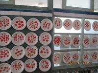 5年生図工の授業の様子です。ワイヤーアートの仕上げです。線を立体的に表現した素晴らしい作品ばかりです。写真を撮り、工夫したところ、見て欲しいところをまとめてみんなで鑑賞していきます。