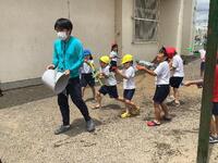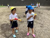 1年生はみんなで水遊びをしました。水鉄砲、ペットボトル、マヨネーズの容器など、様々な道具を持ち寄って思いきり水をかけあいました。濡れても笑顔でとても楽しそうです。