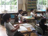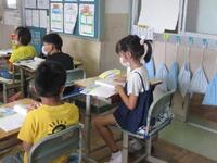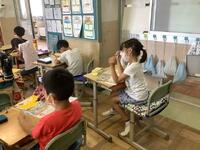 1年生国語の授業の様子です。「数の漢字」のプリントに取り組んでいます。教科書を見ながら、数字と漢数字を線で結んだり、漢数字の読み方を書いたりしています。夏休み前ですが、みんなとても集中しています。
