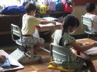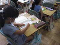 1年生の国語では、ひらがなの総まとめのテストを行っています。2文字の「いぬ」「かめ」や3文字の「いちご」「とんぼ」など、絵を見ながらたくさんの言葉を書いています。3か月間学習してきた成果を発揮しています。
